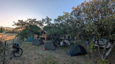 Woensdag hadden we de energie weer terug en gingen we opnieuw off-road. Een langeklim bracht ons naar prachtige vergezichten, gevolgd door een afdaling naar Fontaine-de-Vaucluse. Daar genoten we van crêpes met koffie – het voordeel van fietsen in het voorseizoen: overal plek. De camping bij Robion had zelfs een zwembad, een onverwachte luxe na een stoffige dag.